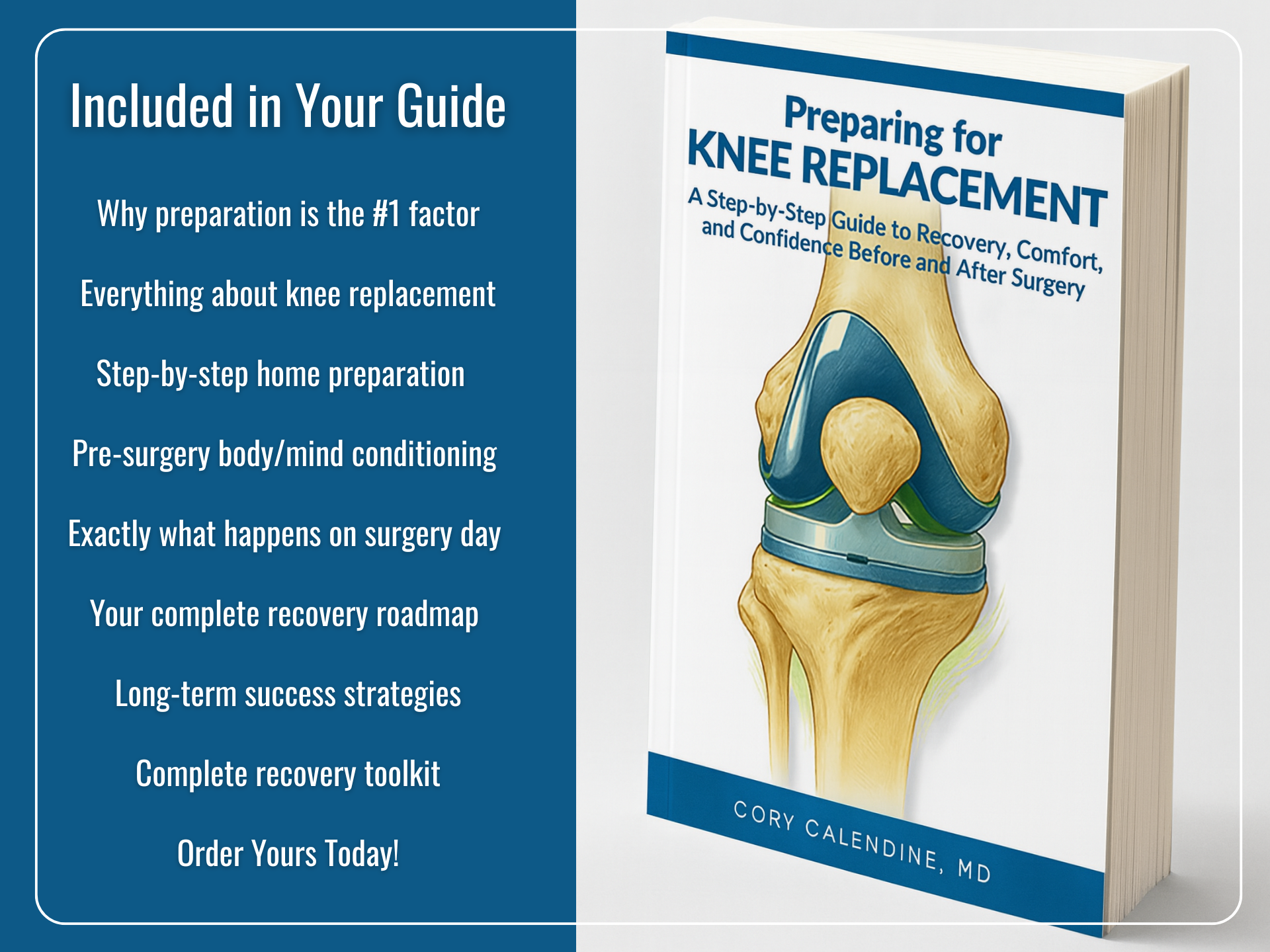 Based on Dr. Calendine's extensive clinical experience and thousands of patient interactions, 'Preparing for Knee Replacement' addresses the real concerns and questions patients face. This comprehensive guide empowers you to approach your surgery with confidence and achieve the best possible results.