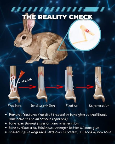 Scientists have developed a portable "bone glue gun" that can print biodegradable material directly into broken bones during surgery. This handheld device melts and shapes a bone-like composite on the spot, potentially eliminating the need for pre-made implants. Early studies show it promotes natural bone growth while providing immediate structural support.